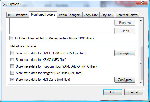 On a My Movies Server/Client or Client, open the Collection Management program, and from the menu select "Configure", "General Options", and select the "Folder monitoring" tab. Scroll down, and check the checkbox "Store meta-data for HDI Dune (AAI files)". Checking the checkbox, the program will ask you to configure details. The configuration options are: